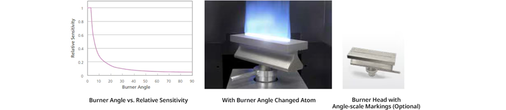 화염 분석 모드에서 버너 각도를 조정하여 흡광도를 낮춤으로써 고농도 원소를 측정할 수 있습니다.