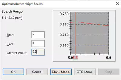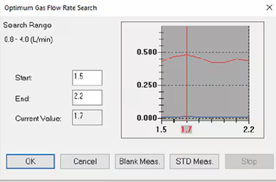 가스 유량 변화에 따른 블랭크 및 표준 시료의 흡광도 변화를 측정하여 가장 높은 감도를 제공하는 유량을 검출하고, 창에 흡광도 차이를 표시한 후 해당 값으로 자동 설정합니다.