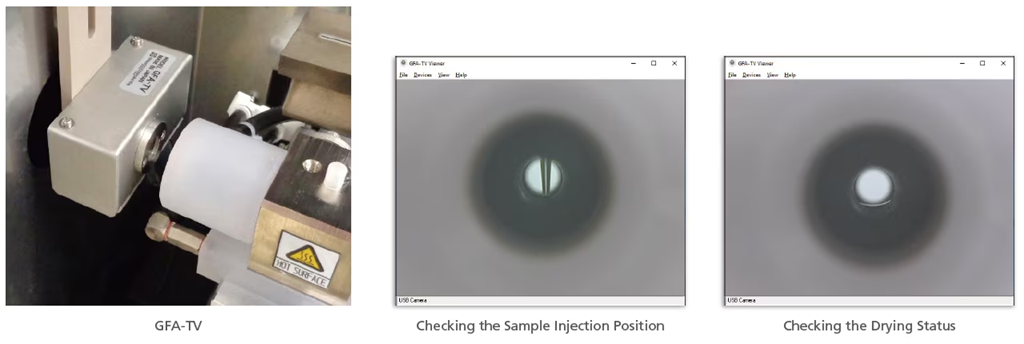카메라는 시료 주입 위치나 건조 상태를 확인하는 데 사용할 수 있어, 온도 프로그램 평가 및 최적화 시 유용합니다. 선명한 영상으로 흑연관 내부 상태를 명확하게 보여줍니다.