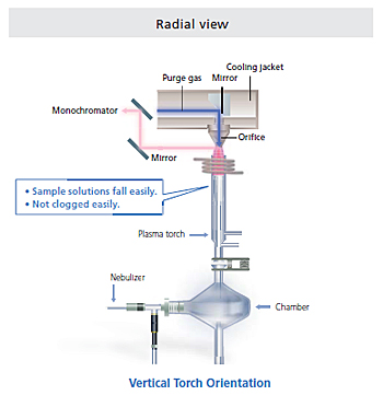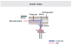 ICPE-9800 시리즈의 Axial Mode는 토치에 수직으로 설치된 측광 장치(냉각 재킷과 오리피스)를 사용합니다.