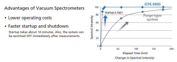ICPE-9800 시스템은 가스 사용량을 줄이는 세가지 기능(Eco-Mode, Mini-Torch, 진공 분광기)을 포함하고 있어 아르곤 가스의 소비량을 크게 감소시켰습니다.