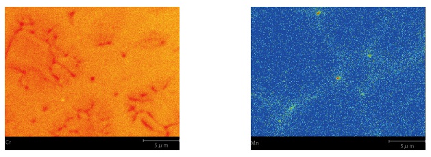 A mapping analysis of stainless steel was performed with a beam current of 1 μA at a magnification of 5,000x. (Left) The distribution of phases with slightly different Cr concentrations is precisely captured. (Right) The system succeeds in visualizing a distribution of Mn content under 0.1 %.