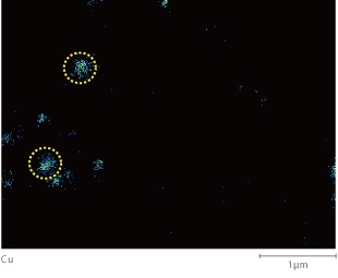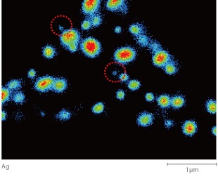 This data is from a mapping analysis of areas in lead-free solder containing a large amount of Ag. (Accelerating voltage: 10 kV; beam current: 20 nA) The shape of the particles in the Ag X-ray image agrees well with the shape of the particles in the BSE image (COMPO). It is evident that the particles with a diameter of about 0.1 μm, indicated by the red dashed lines, are also Ag particles. In addition, the existence of Cu-containing particles can also be confirmed, as shown by the yellow dashed lines.